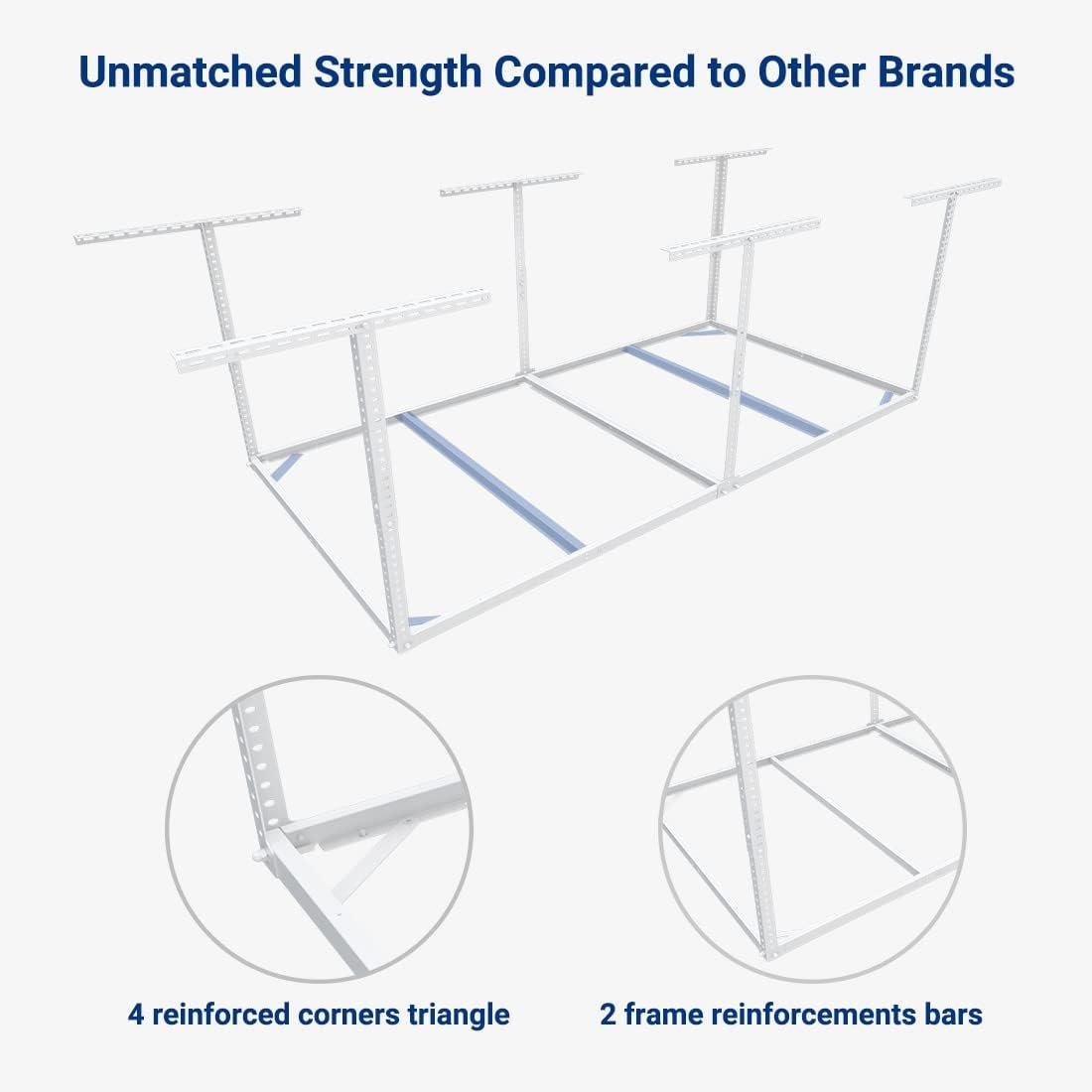 - 1200 lbs Tested, 600 lbs Rated: Our overhead garage storage rack undergoes rigorous double load testing (1200 lbs) to ensure unmatched safety and durability, supporting up to 600 lbs for your tools and equipment.