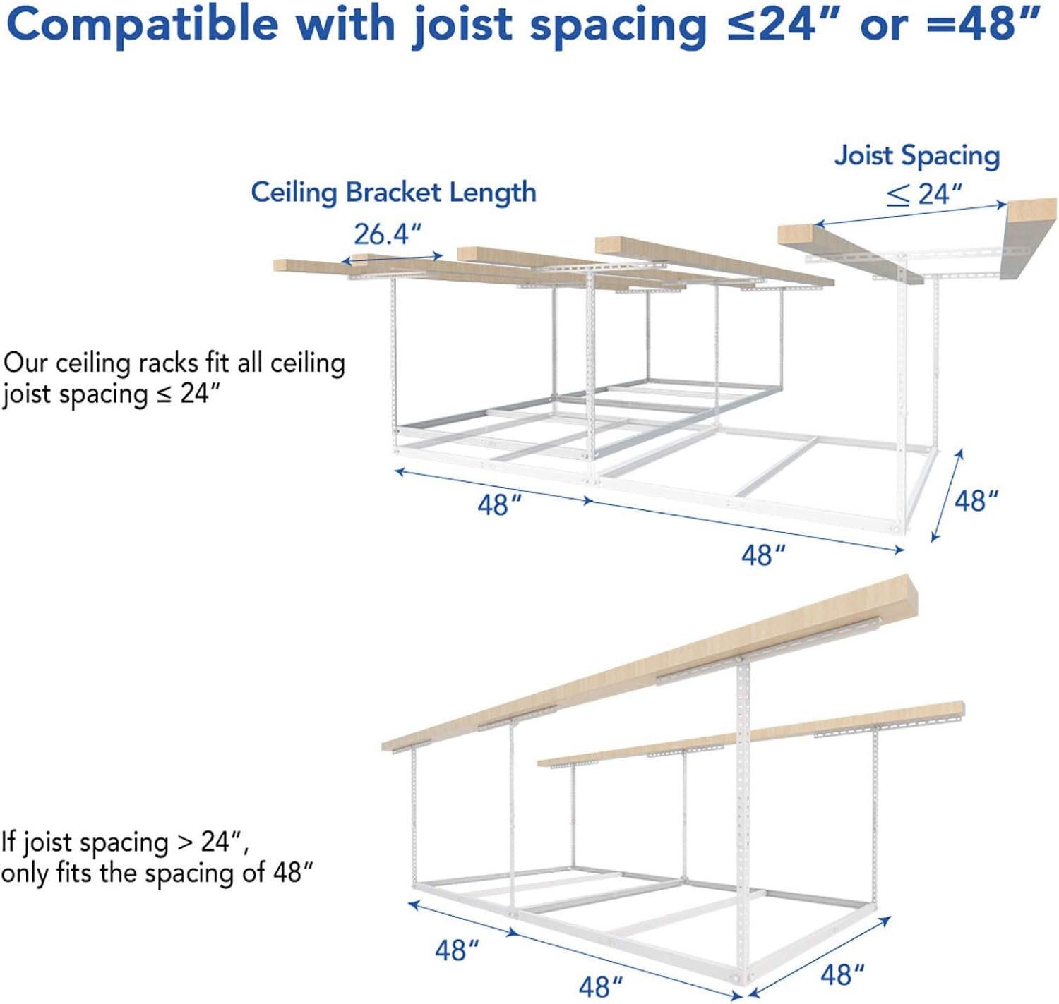- DIY INSTALLATION: Installation Template helps drill mount holes. This overhead storage rack fits all ceiling joist spacing ≤ 24″, if joist spacing > 24″,only fits the ceiling spacing of 48″.