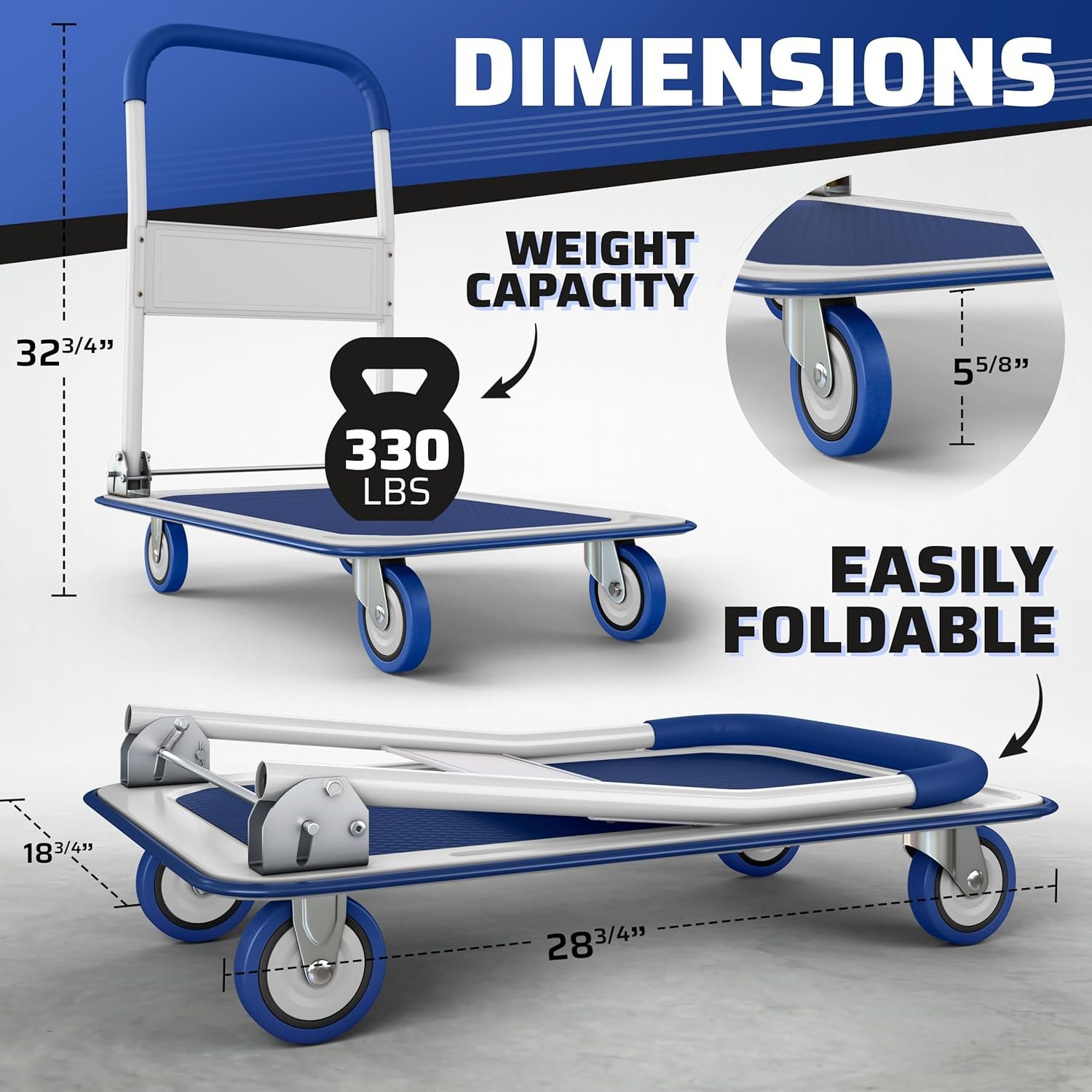 - ✅【 EASY MANEUVERABILITY 】 The dolly is equipped with four, 4 inch wheels for maximum maneuverability and stability. Larger wheels helps our platform hand truck move over rugged terrain with ease with minimum effort. Have the peace of mind this foldable dolly will tackle any situation with no trouble at all.